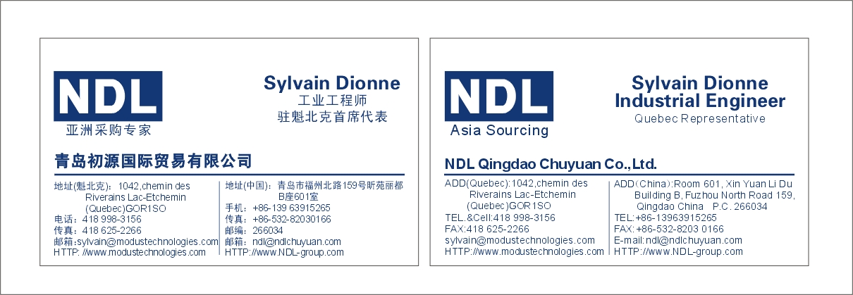 Modus Technologies est représentant pour NDL Qingdao Chuyuan Co., une compagnie chinoise qui se révèle la clé de votre succès pour réussir vos importations. NDL est une compagnie qui comporte 25 ingénieurs en qualité et processus pour comprendre vos besoins, sélectionner la bonne entreprise chinoise, assurer la qualité de vos produits fabriqués et en faire la livraison.